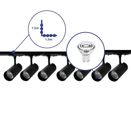 | Fabrikantnaam | Complete L shaped 1-Phase Track Set Black incl. 7x Spot fixture + GU10 2700K 3W Dim – 1,5 x 1,5 mete | |